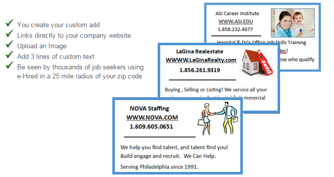 Our advertising program works similar to Google Adwords (but much less expensive) and displays on the e-Hired Website and will be